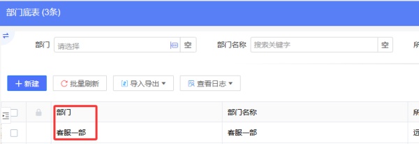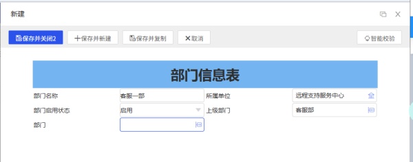 在无流程表单“部门名称”中录入客服一部,此时“部门”字段为空会创建部门;