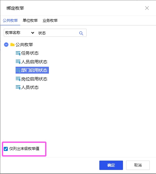“部门启用状态”:下拉控件,绑定公共枚举中的“部门启用状态”,绑定时需勾选仅列出末级枚举;